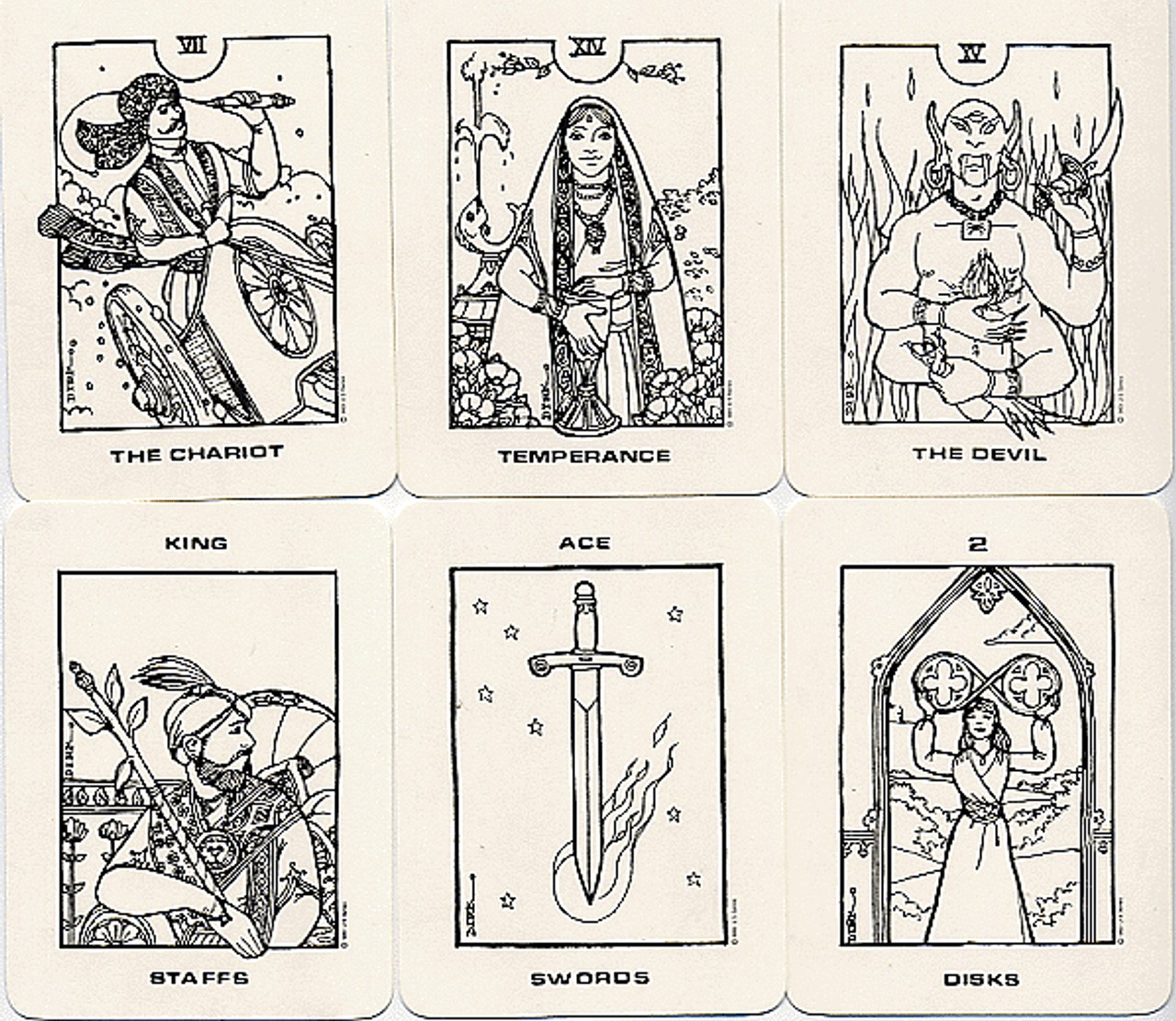 Los colores de las cartas son sencillos, con dibujos de líneas negras sobre blanco liso, pero la temática es exótica y combina símbolos del tarot con arte de Oriente Medio.